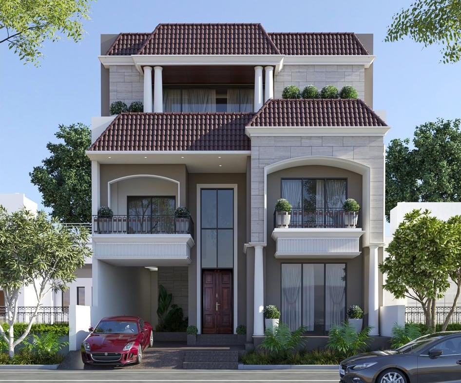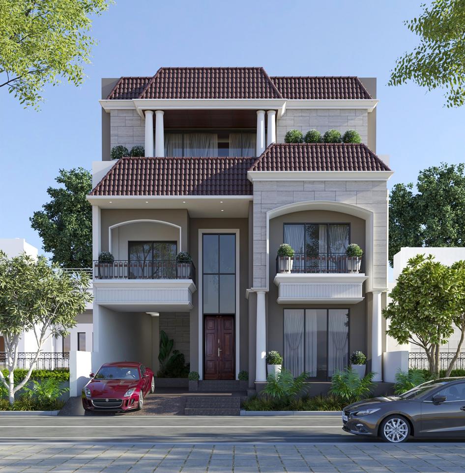 A beautifully planned independent luxury villa with a grand, modern-classical elevation, designed for space, light, and privacy.